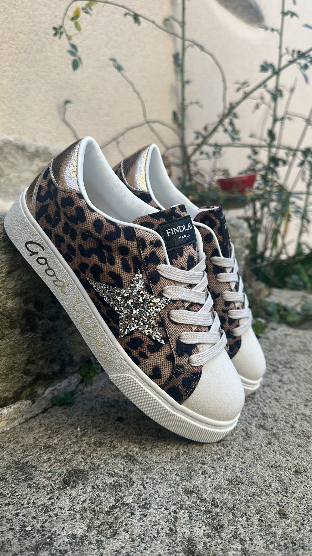 Baskets imprimé léopard avec étoiles pailletés.