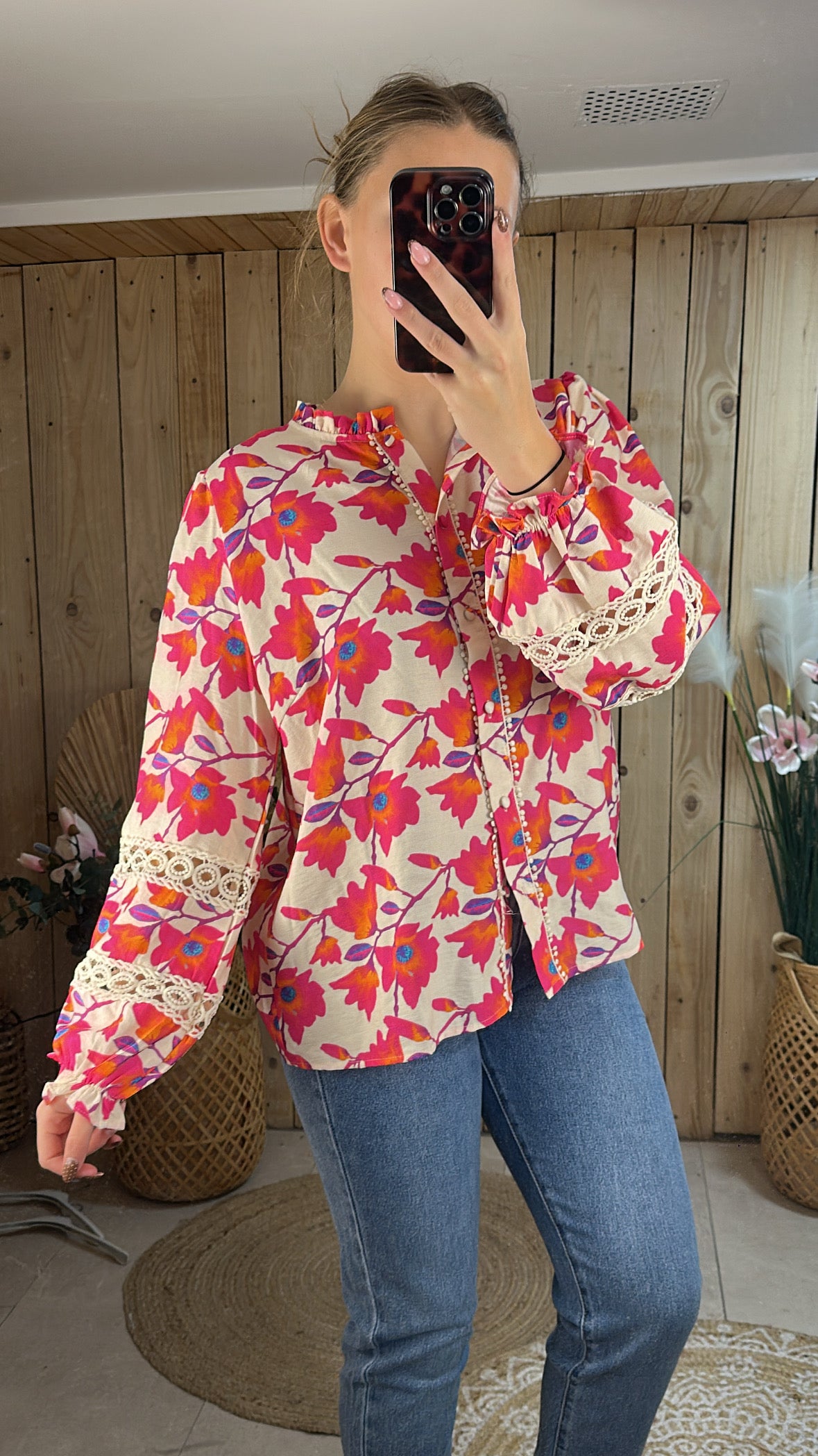 Laissez-vous charmer par l'esprit printanier de ce chemisier aux fleurs éclatantes. Ses teintes de rose et d'orangé apportent une énergie incroyable à votre tenue, tandis que ses détails de dentelle et de pompons lui confèrent un look bohème irrésistible. C’est la pièce forte idéale pour réveiller un jean basique avec élégance et féminité.