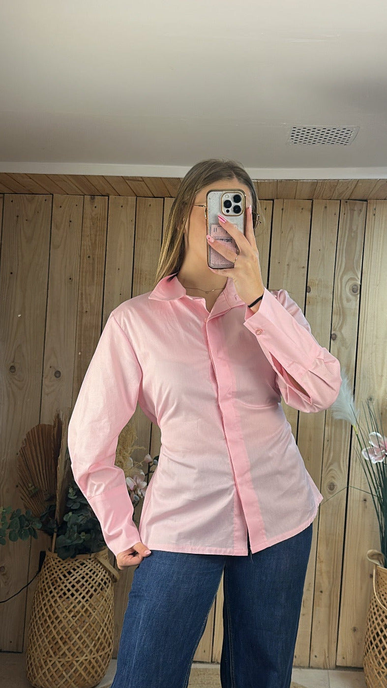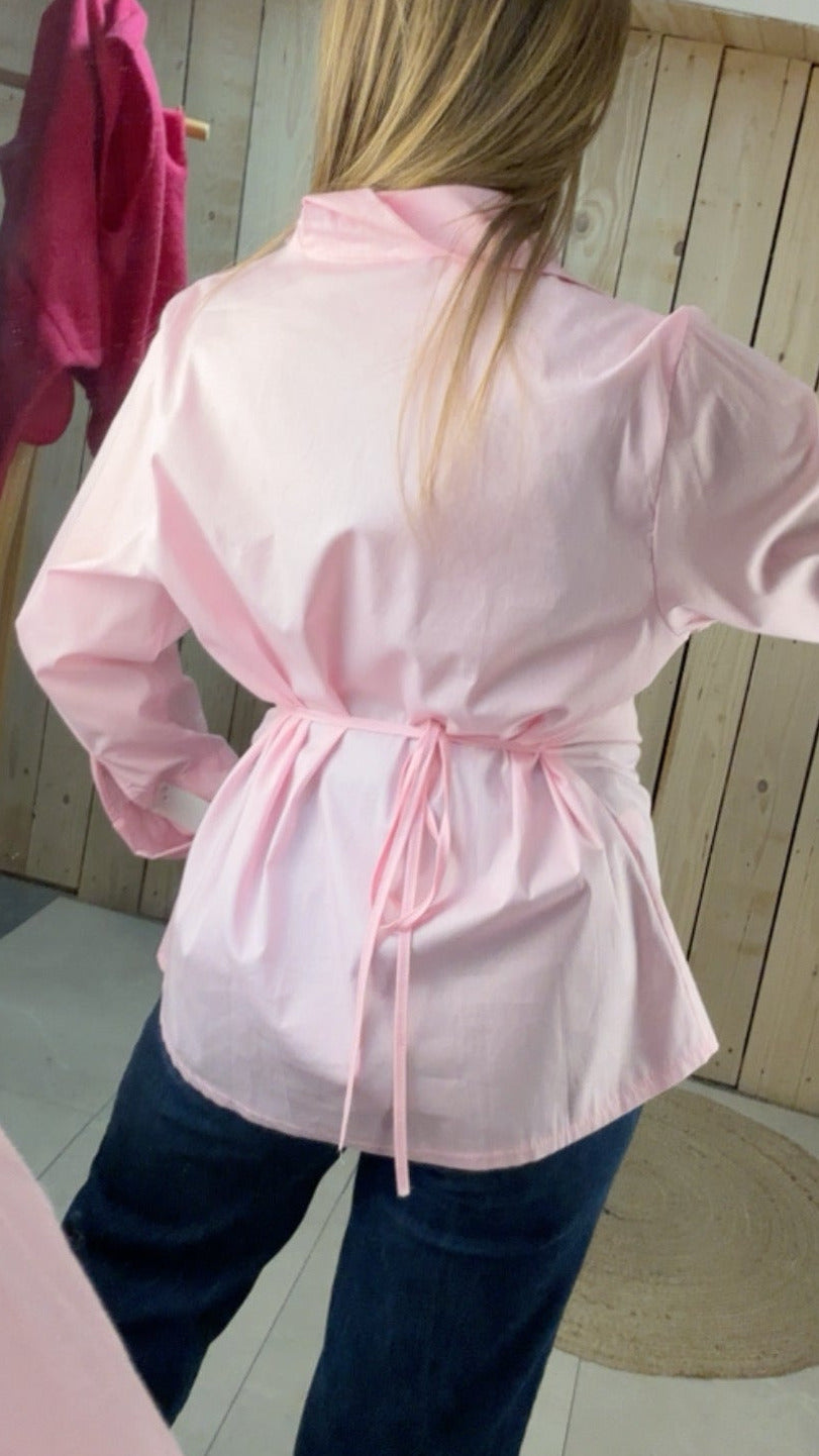 Sublimez votre allure avec cette chemise rose pastel, le parfait mélange entre chic classique et modernité. Sa coupe cintrée par un lien délicat à nouer dans le dos souligne la taille avec élégance, offrant une silhouette féminine et structurée tout en légèreté.