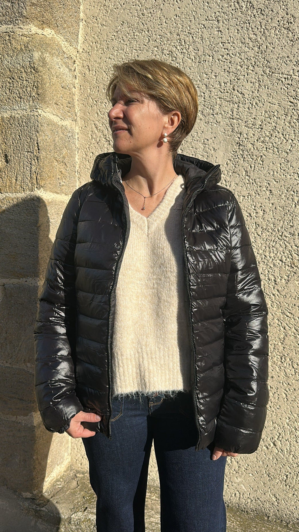 Doudoune noir imperméable réversible 1 coté brillant et un coté mat.
