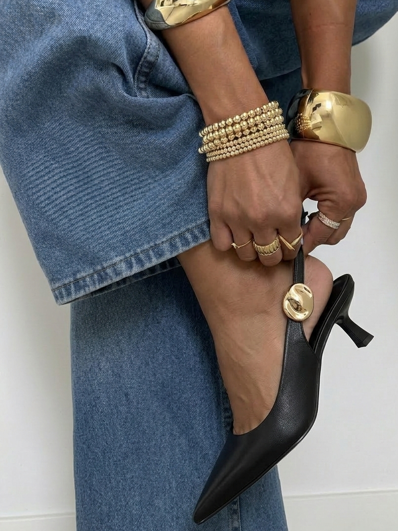 Élève ton style en un clin d'œil avec ces escarpins à l'élégance absolue. Leur design épuré en cuir noir est sublimé par un détail bijou doré sculptural sur la bride, apportant une touche de luxe immédiate à ta silhouette. Avec leur petit talon "kitten heel" ultra-tendance, ils t'assurent une démarche assurée et confortable, du matin jusqu'au bout de la nuit.