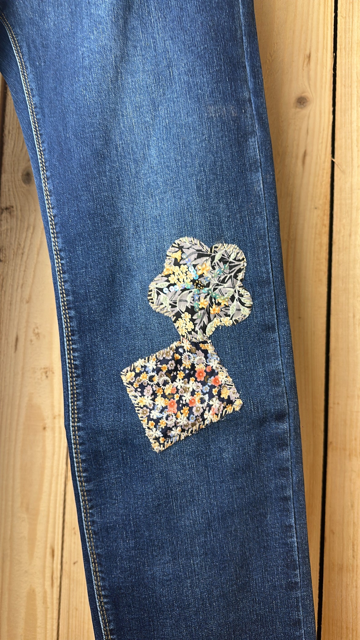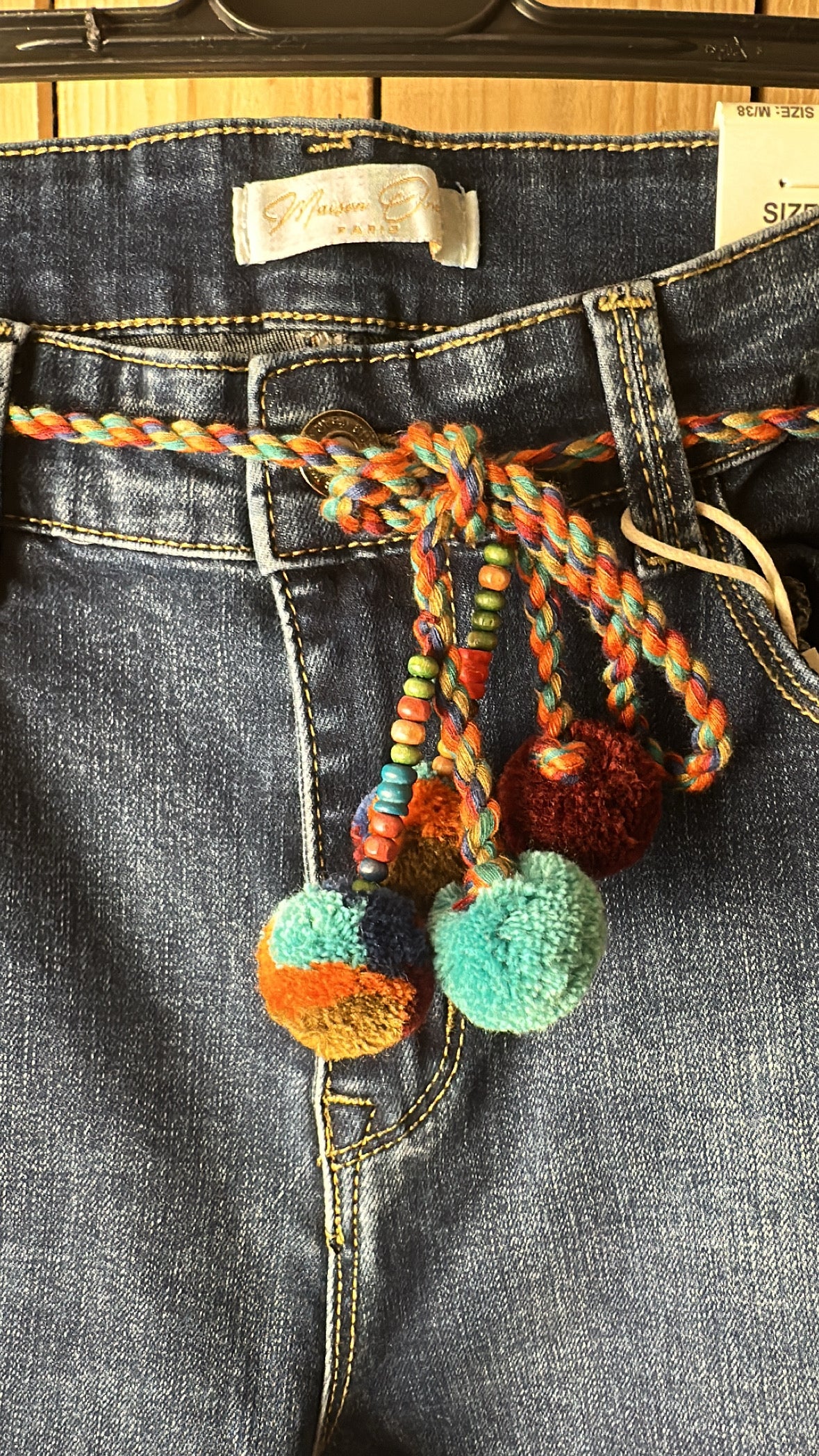Jean coupe droite avec patch sur la face avant et pompons fantaisies