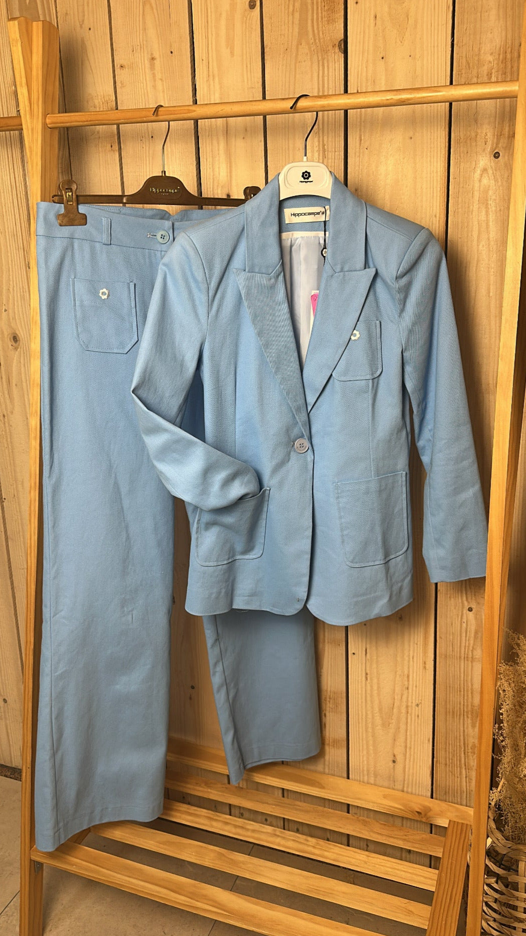 Pantalon tailleur hippocampe bleu ciel en coton.