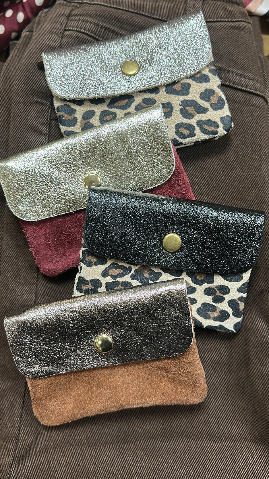 Mini pochettes couleur unie et léopard avec des paillettes.