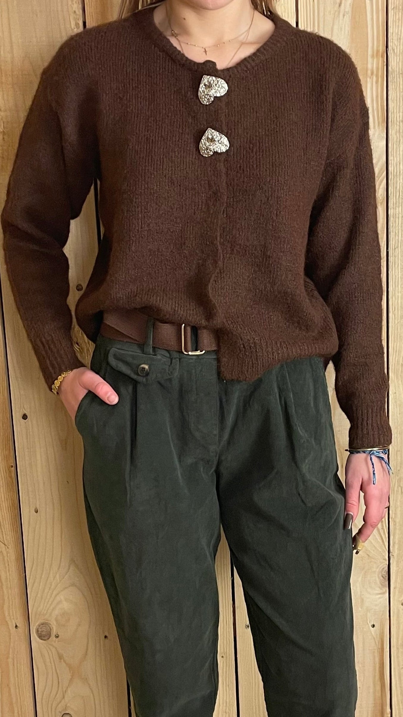 Pull marron orné de deux cœurs.