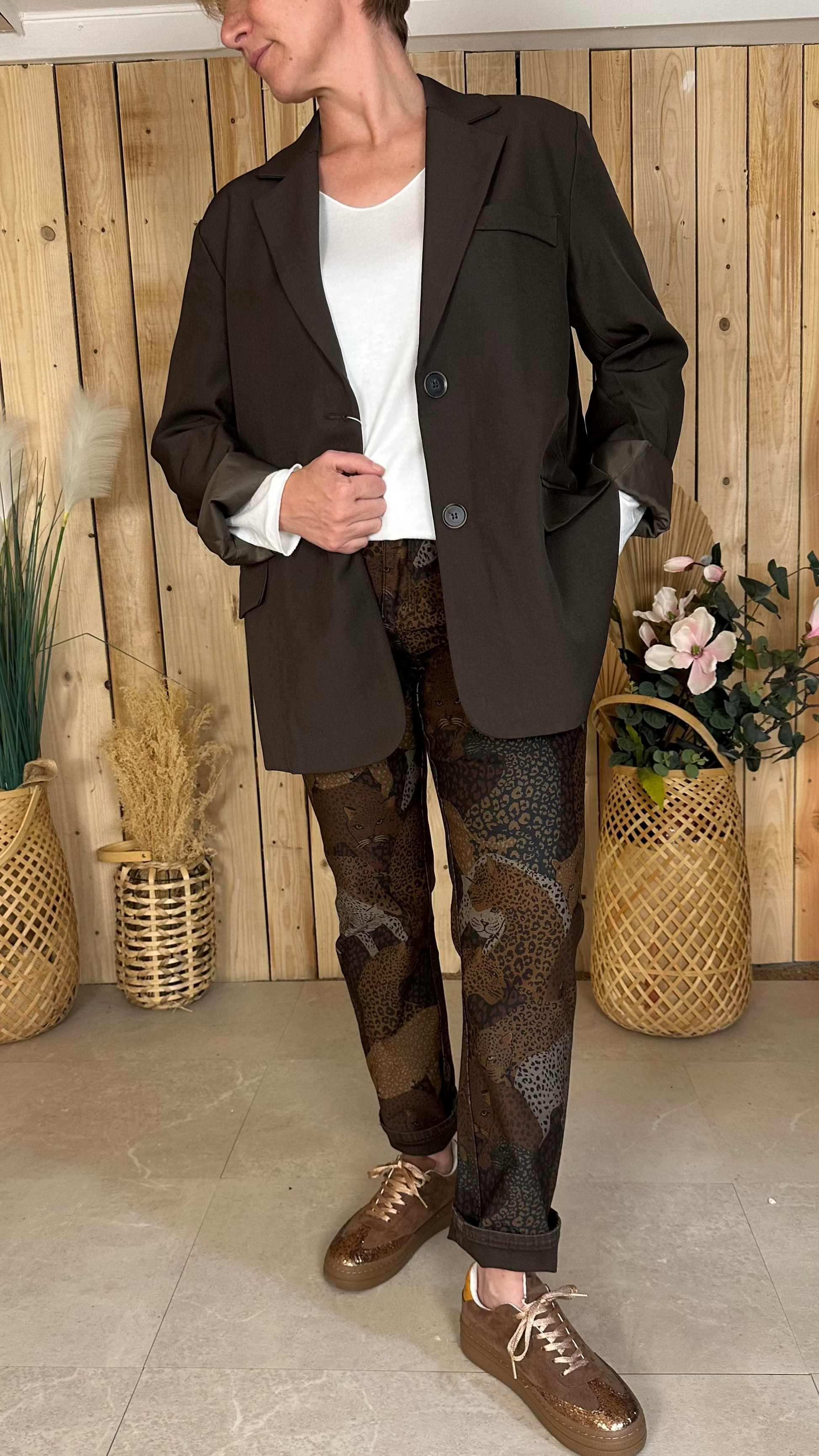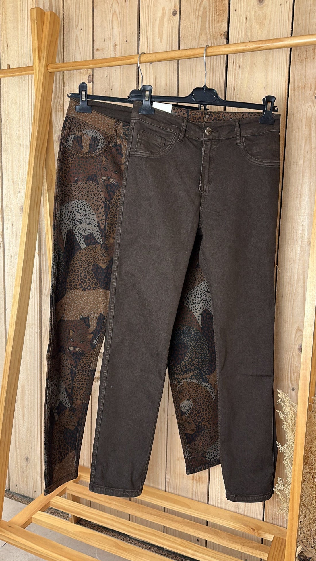 Jean chocolat réversible, 1 coté à motif tigre, un coté couleur chocolat uni.