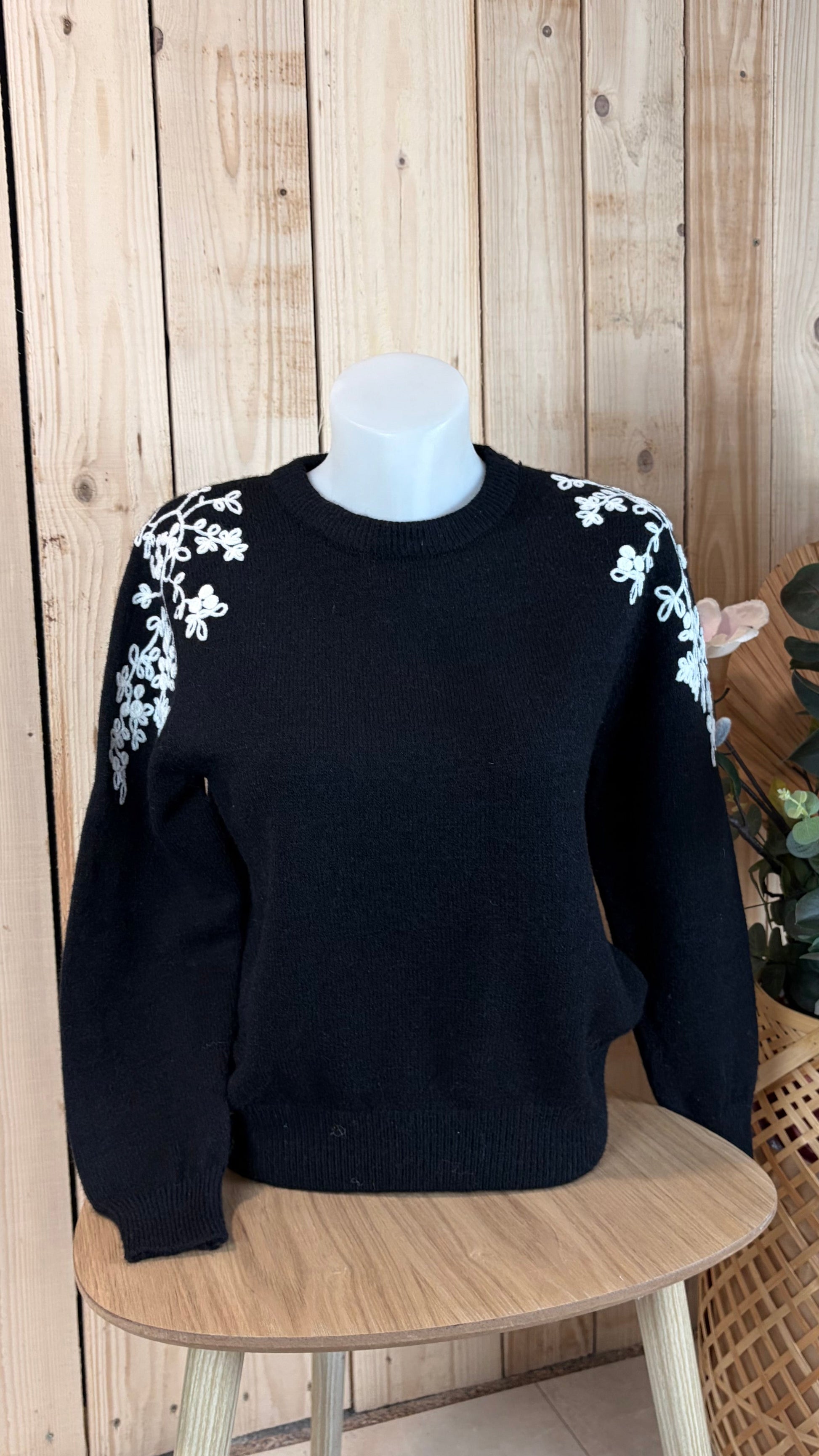 Pull noir avec détail de broderie blanc sur les cotés.
