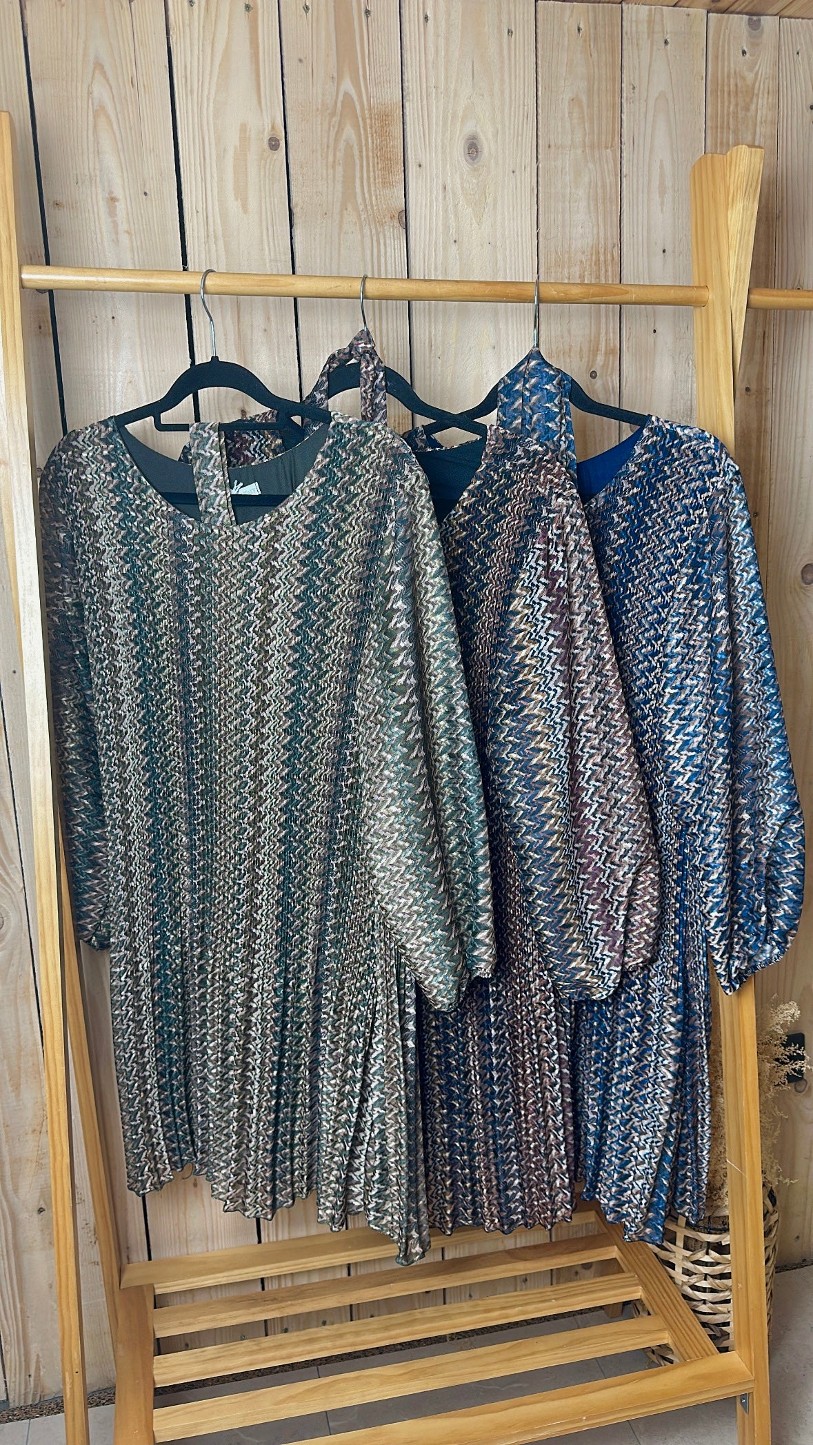 Robe courte plissée à motifs kaki et écru accompagné d'une ceinture aux même mo