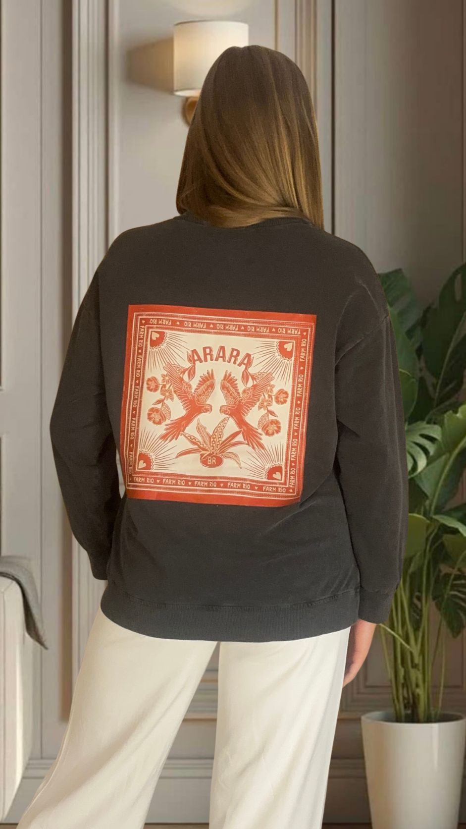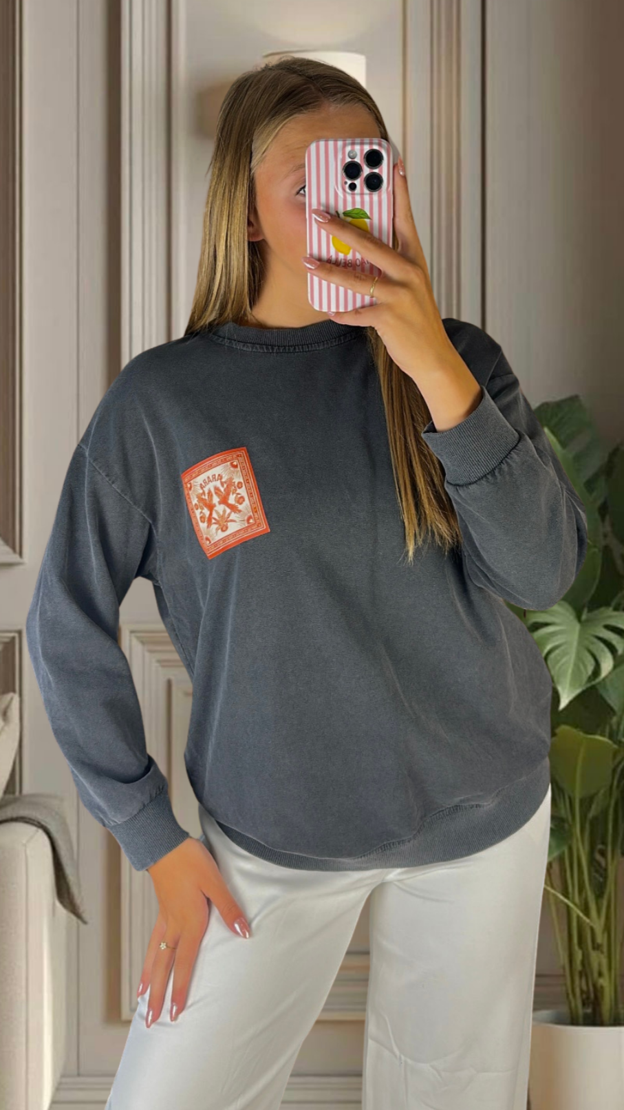 Sweat gris sans capuche avec motif rouge à l'avant et à l'arrière.